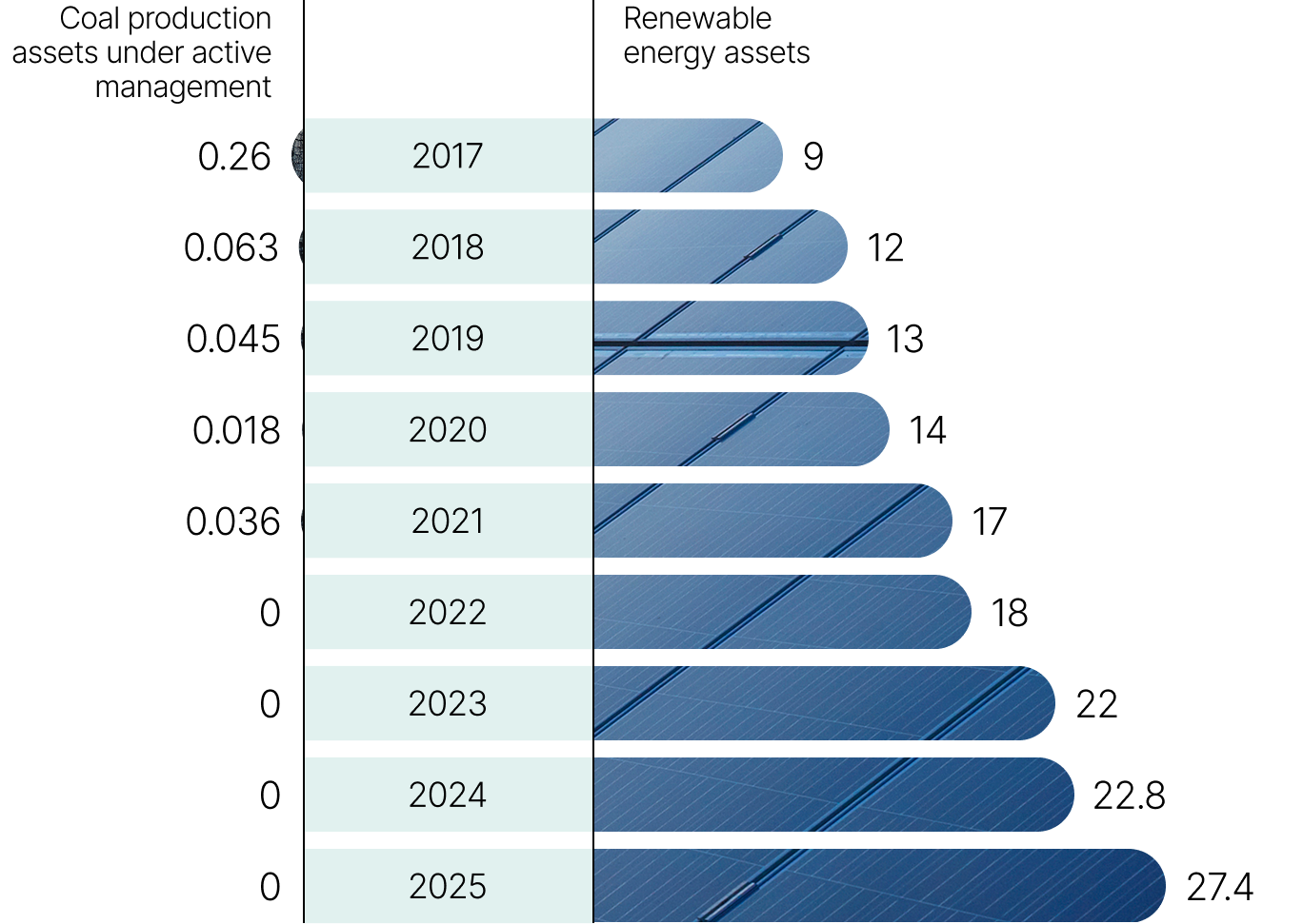 Renewable energy assets represent a significant portion of our portfolio, while oil and coal production is now excluded (in $B)