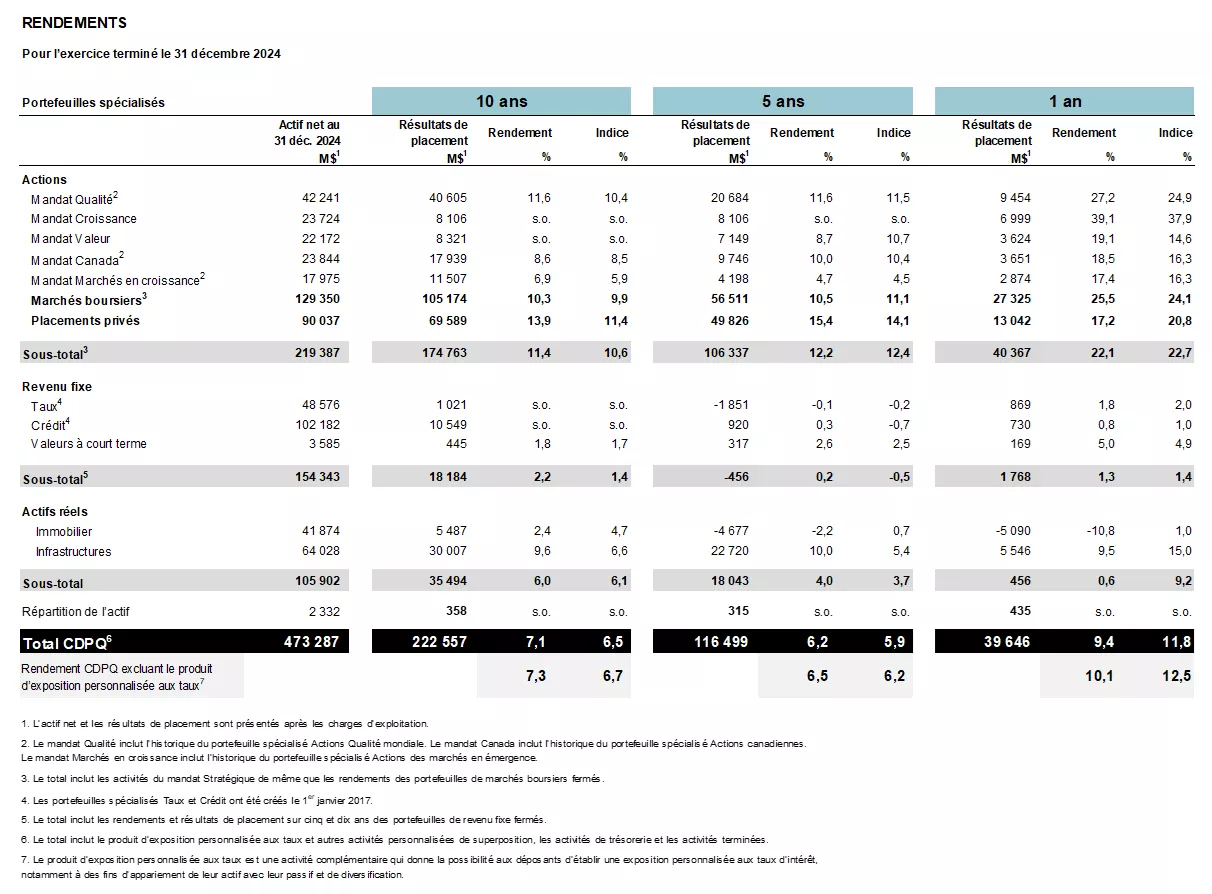 La CDPQ présente aujourd’hui ses résultats financiers pour l’exercice terminé le 31 décembre 2024. Le rendement moyen pondéré des fonds de ses déposants s’établit à 9,4 % sur un an, sous son portefeuille de référence à 11,8 %. Sur cinq ans, le rendement annualisé se situe à 6,2 %, au-dessus de son portefeuille de référence à 5,9 %. Sur dix ans, il se chiffre à 7,1 %, également supérieur au portefeuille de référence à 6,5 %. Au 31 décembre 2024, l’actif net de la CDPQ s’élève à 473 G$.
